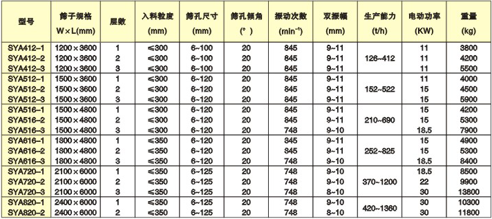 产品简介:SYA型圆振动筛是我公司参考国内外同类机型加以改进后的产品。适用于对冶金矿山、碎石场、煤矿以及其他行业的大、中粒级散状物料进行干湿式分级。 该筛机的筛箱由托架与侧板铆接